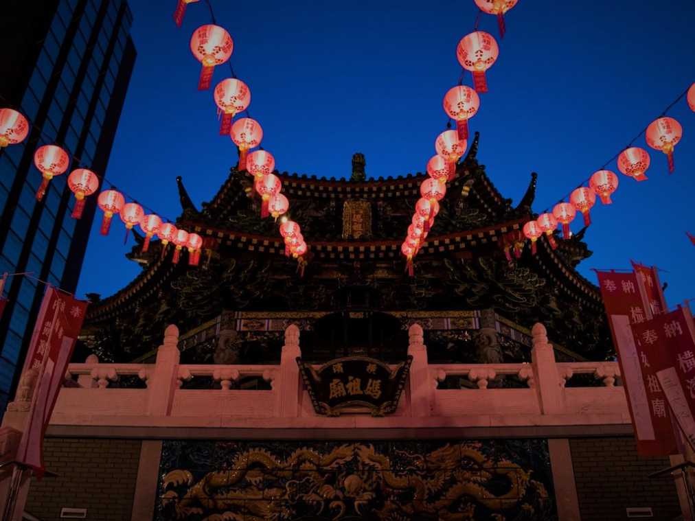廟堂から入口の門へとかかる赤い提灯がとっても中国っぽい!青空に映える提灯も美しいけれど、灯がともる夕暮れ時がおすすめです。昼間より比較的参拝者が少ないので、ゆっくり写真が撮れますよ!