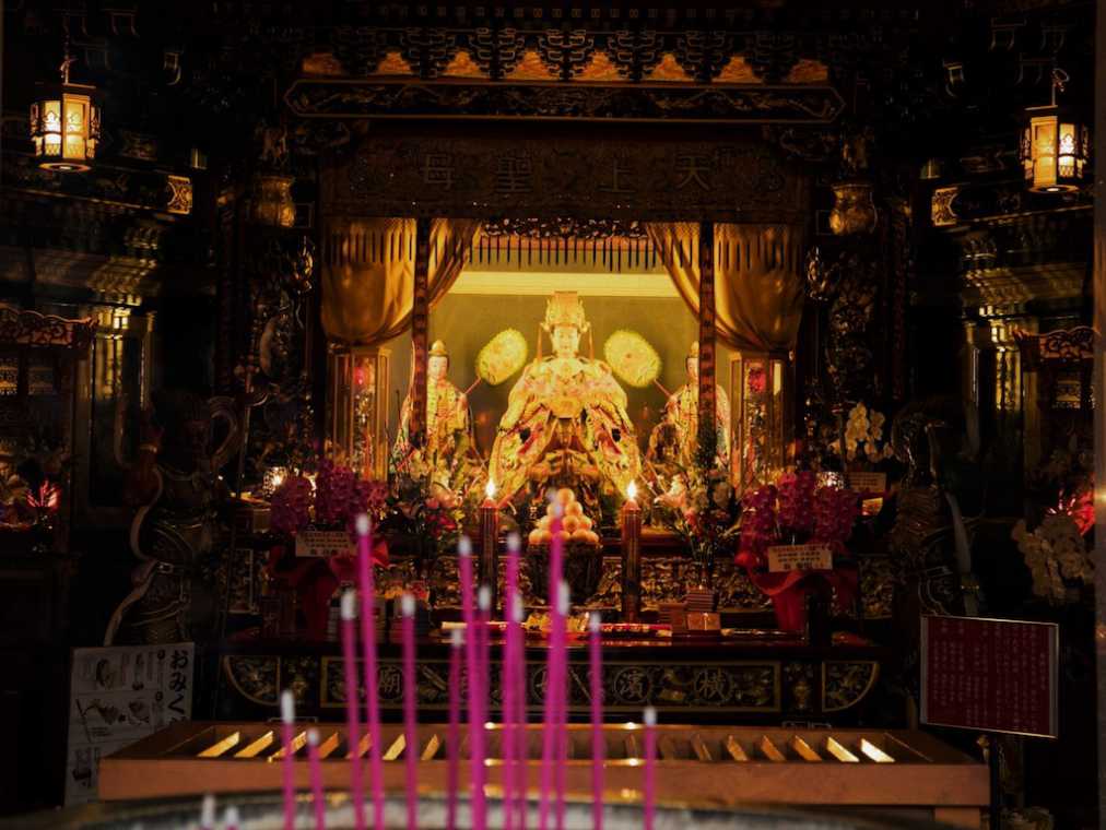 廟堂中央には、天上聖母・媽祖がまつられています。「媽祖」は、十世紀ごろの中国に実在した人物なのだそう。航海の安全を願って人々を災害や疫病から守ったと伝えられています。護国救民の神様として人々から大切にされているんですよ!日が暮れるとお廟の中の優しい光に包まれて、一層神秘的な媽祖を見ることができます。