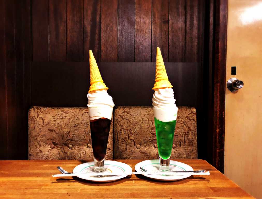 そして「喫茶DEN」のもう1つの名物といえば、このインパクト大の「コーヒーフロート」と「クリームソーダ」(ともに550円)!たっぷりのソフトクリームにコーンが帽子のように乗っています。
