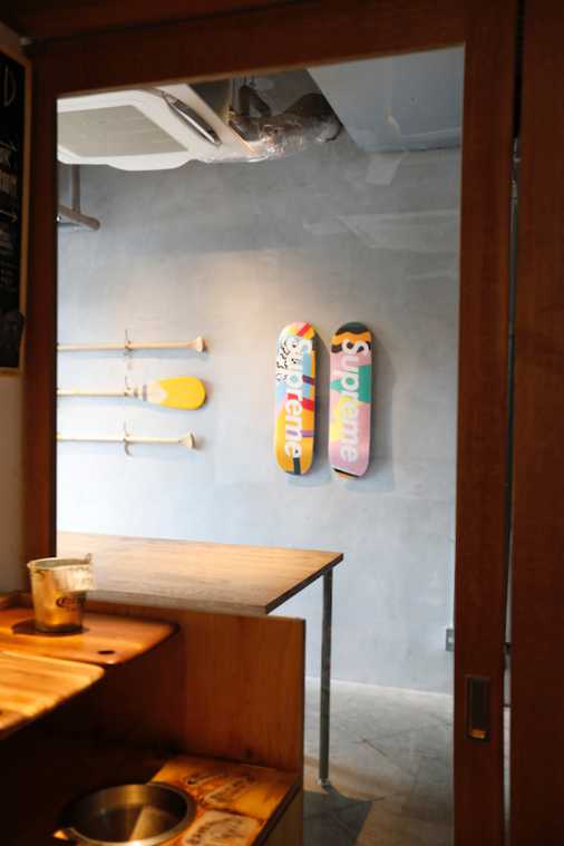 テラス席だけでなく、店内だってとことんおしゃれ。サーフテイストを取り入れたアメリカ西海岸をイメージした広々としたダイニング。入口すぐの壁には目の前を流れる大川のイラストがペイントされています。