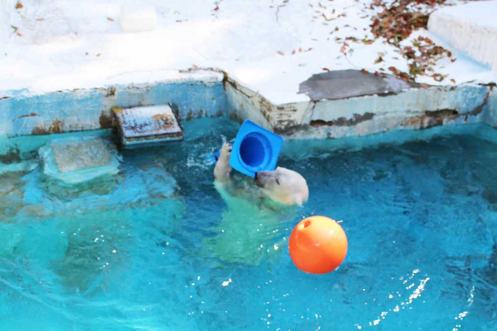 4歳の女の子でまだまだ遊び盛りの彼女は、ボールや浮き、三角コーンなどをおもちゃに水しぶきを上げながら動きまわります。その姿の愛らしいことと言ったら!いつまでも見ていられます。個人的には、水中をグルリと回転したときにちらっと見える、足の裏がツボです。