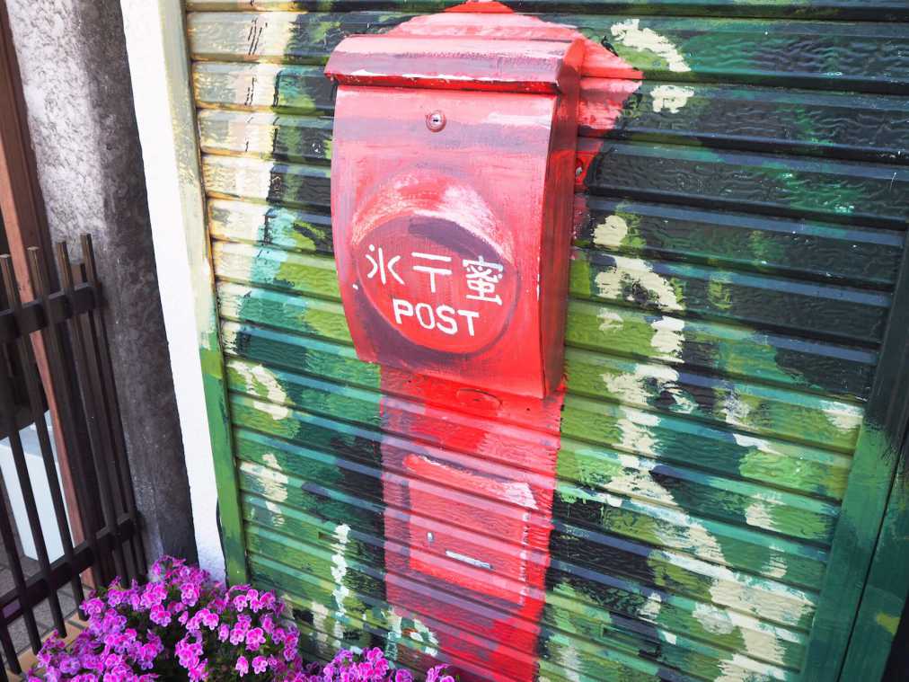 お店の外観は昭和レトロな雰囲気です。シャッターに描かれた真っ赤なポストや入口の赤いドア、水色の掲示板といったアイテムがなんともかわいらしく、フォトスポットにもなっています。