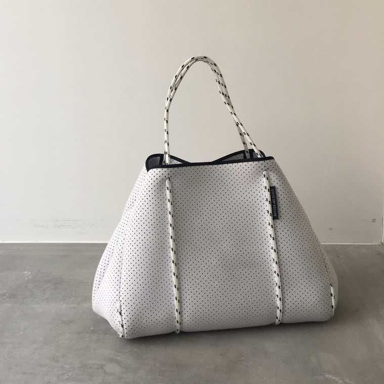 雨の日ならずとも愛用している、このトートバッグ。「STATE OF ESCAPE(ステイトオブエスケープ)」というブランドのものなのですが、本体はサーフィンのボディスーツにも使われている素材なんです。なので、とびきり軽くて、丈夫で、収納力も抜群。自宅の洗濯機で洗えて、おまけにデザインもこなれた感じとくれば、人気が高いのもうなずけます。もちろんこのブランド以外にも、ビニール素材やナイロン製など、雨に強くて、同時に見た目にも夏らしさを両立するバッグがたくさん出ているので、好みのタイプを探してみてください。