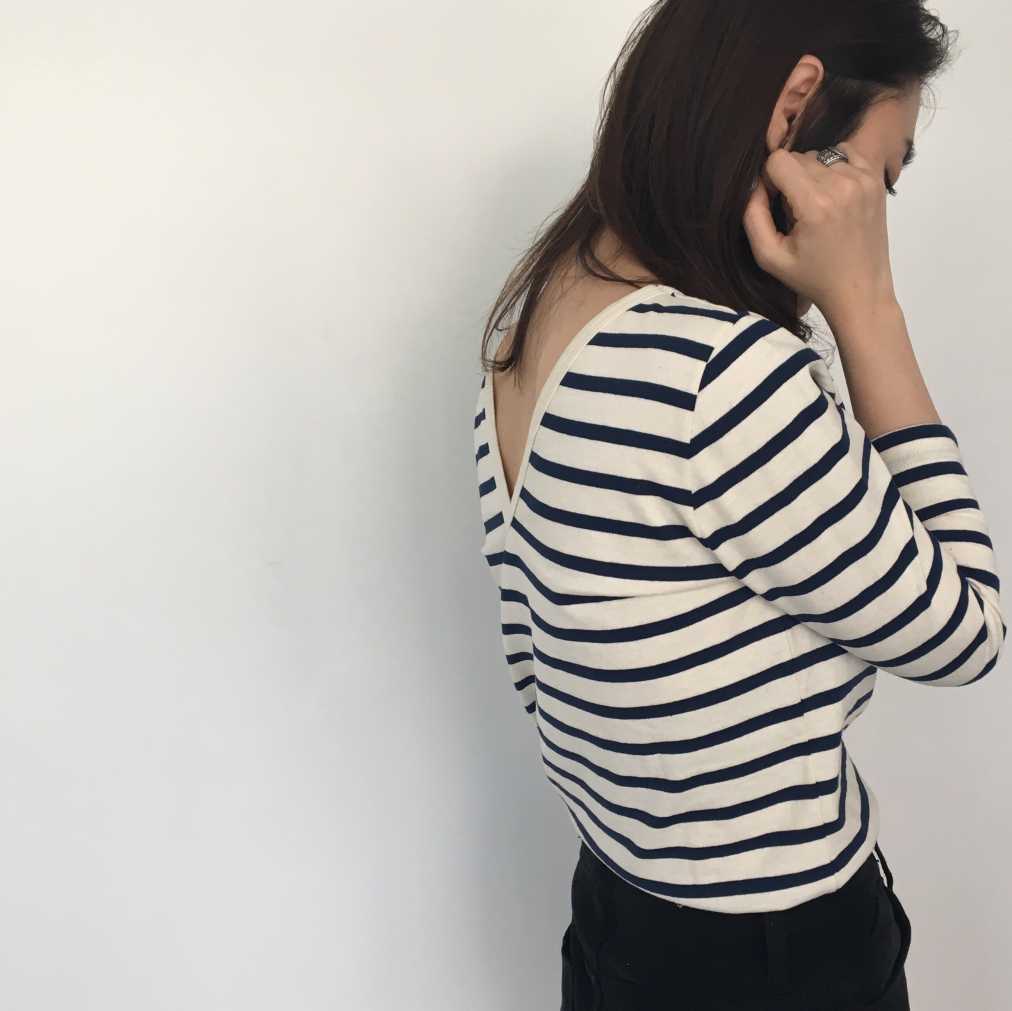 “濡れてもいい服”というと、どうしてもカジュアルになりがちなので、必ずコーディネートのどこかに女っぽさをプラスするようにしています。例えば、少し男の子っぽいナイロンジャケットを脱いだら、中は背中が大きく開いたカットソーを着ていて、そのギャップを楽しんだり。ボトムは、やはり暗めの色やデニムが多くなりがちなので、インナーでフェミニンなものを取り入れるのが簡単です。ちなみに今回は、最初に赤いバレエシューズを選んだので、トップスはボーダーでトリコロール配色にまとめて、フレンチマリンなイメージに。