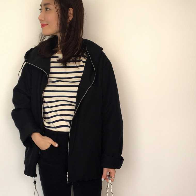 少し肌寒い雨の日は、いわゆるレインコートの代わりに、フードつきのナイロンジャケットを。そもそも天候に関係なく、この手の薄軽ナイロンアウターは、さっと羽織るだけでいつもの服をモダンに見せてくれて、大活躍のアイテム。写真のように、デニムにゆるっと着るのもいいですし、あえてフェミニンなワンピースと組み合わせてMIXコーディネートを楽しむのも好きです。また、きれいめなトレンチ型の撥水アウターなど、雨用アウターも今はバリエーションが豊富なので、一枚備えておくとオンオフ問わず重宝します。