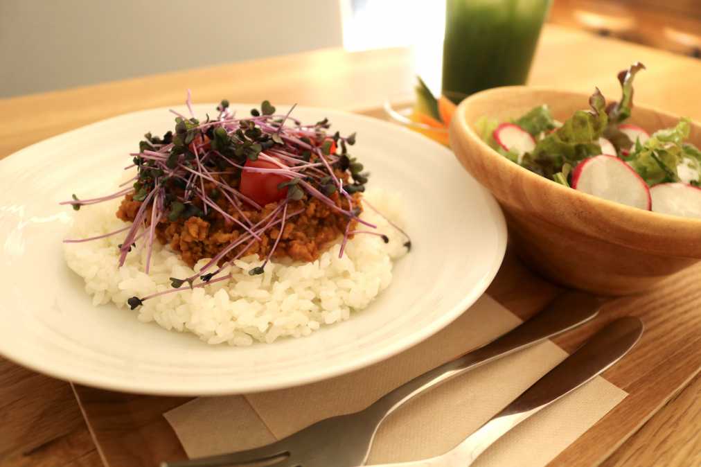 新鮮なムラサキキャベツの芽をあしらったキーマカレー750円。ご主人のこだわりでスパイスから添加物なし。ひと口ほおばると、甘く広がるシナモンの香りとひき肉の食感。噛んでいるうちに刺激的なスパイスがどこからともなくやってきては、口の中で融合。リピーターが多いのも納得の味です。