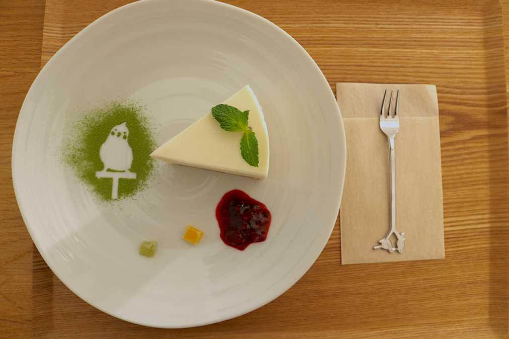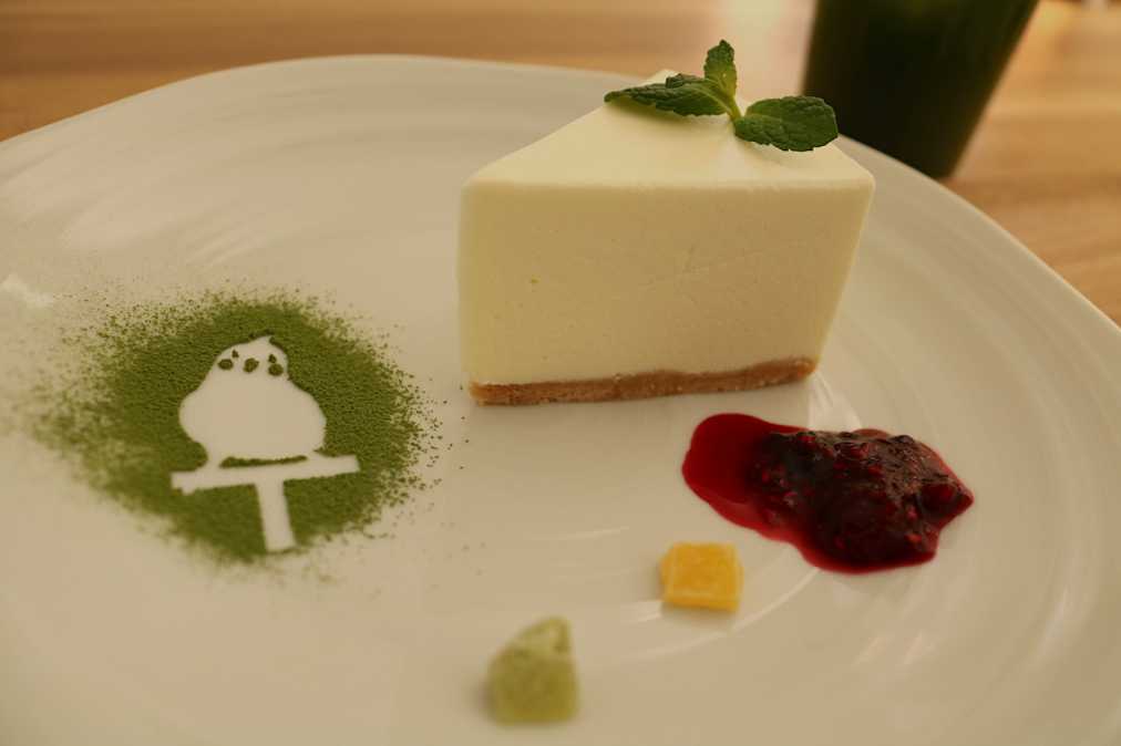 オカメインコを可愛く浮かび上がらせた抹茶パウダーと甘酸っぱいベリーソースを添えた「レアチーズケーキ」450円。