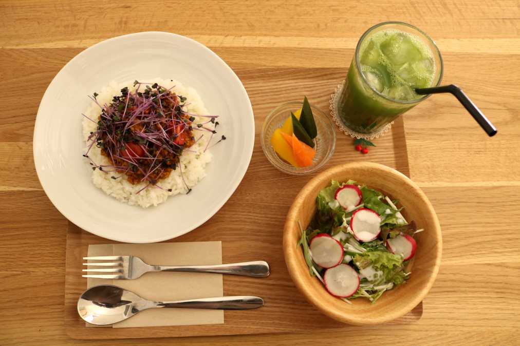 カレーにはサラダとピクルスがついて満足度大。セットドリンクは200円引きなので、グリーンティー350円(セットで150円)を注文。