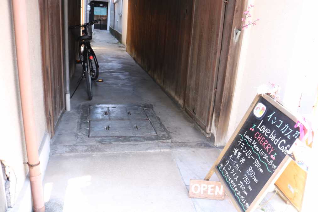 大通りを一筋それると、こんな細い路地奥にインコカフェ