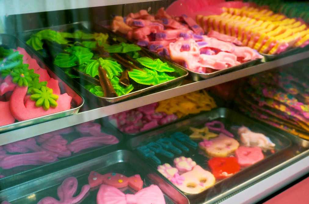 次に、ショーケースの中に並ぶトッピングを選びます。とってもカラフルなトッピングはどれも、チョコレートやクッキーでできています。フラミンゴや猫、リボンにハートなど、女子の心を奪うかわいすぎるビジュアルにキュン!うーん、これはどれをトッピングしようか迷ってしまいます。