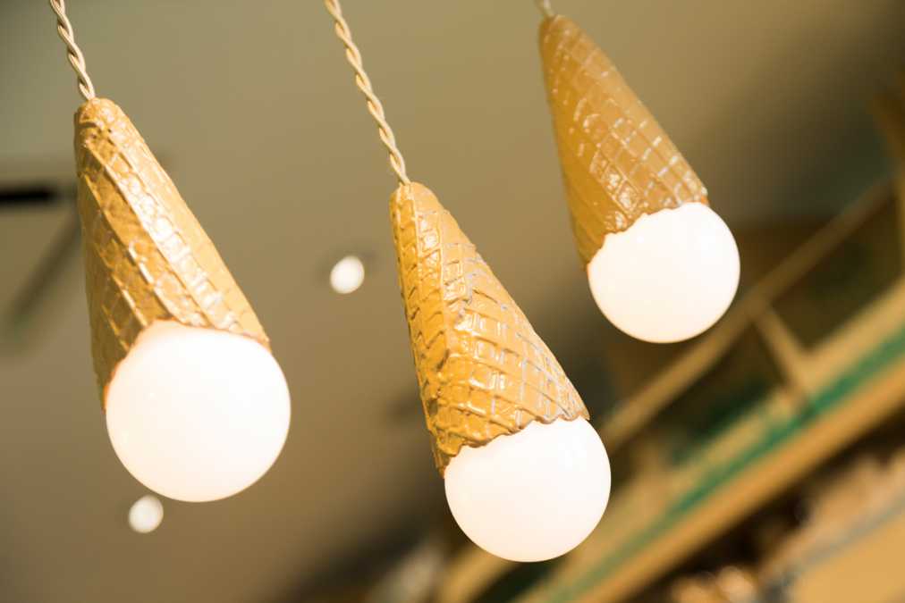 レジの上にはアイスクリーム形のペンダントライト、ショーケースの後方にはアメリカンな雰囲気のネオン管が!女子のハートをつかむインテリアにも注目です。