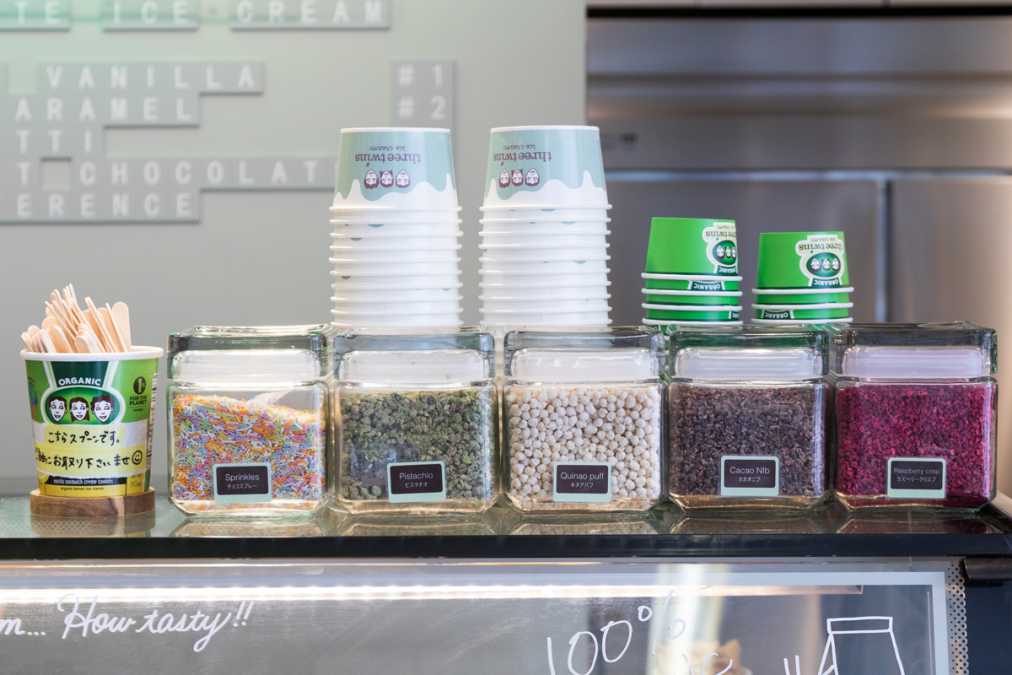 トッピング(各+86円)は、カカオ豆を砕いたカカオニブ、食物繊維たっぷりのキヌアパフ、ビタミンE豊富なピスタチオ、甘酸っぱいラズベリークリスプ、野菜やウコンの色素で色づけしたチョコスプレーの5種。オーガニックアイスクリーム専門店だけあって、トッピングもヘルシーな食材にこだわっています。