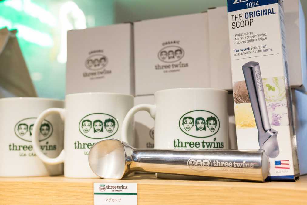 業界スタンダードであるゼロール社のスクープ(3240 円)をロゴ入りで販売。手のぬくもりを瞬時に伝え、カチコチに凍ったアイスクリームでもすくいやすいのが特徴です。創業者の双子の兄弟と兄の妻を描いたイラストがかわいいマグカップ(1296円)もあります。