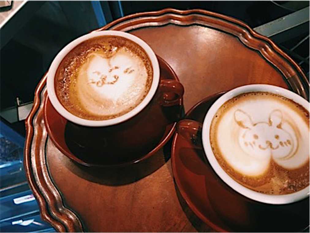 うまくできず意気消沈していると、藤宮さんが特別にイラストのラテアートにチャレンジさせてくれました(普段は行っていません)。藤宮さんはミルクの形を生かしたネコ、私はミルクの部分をキャンバスに見立てたウサギを描きました!