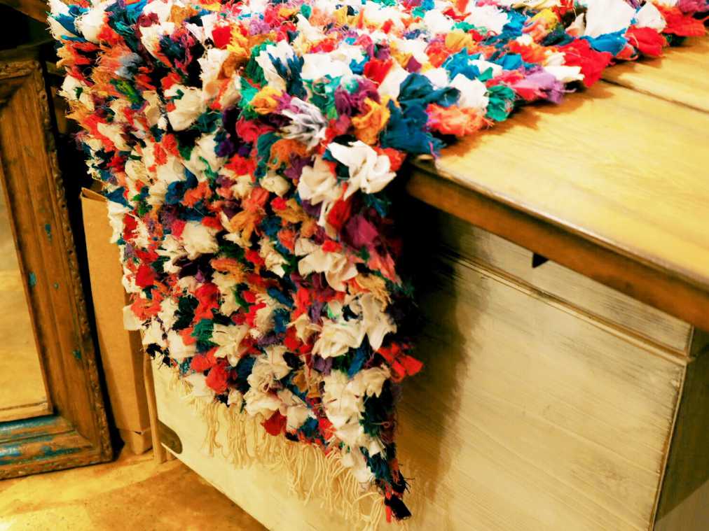 とっても華やかなこちらはモロッコ製のリサイクルラグ。古着を細かく裂き、布に縫い付けた伝統工芸品です。玄関前やベッドの横に、アクセントとして置きたいですね。
