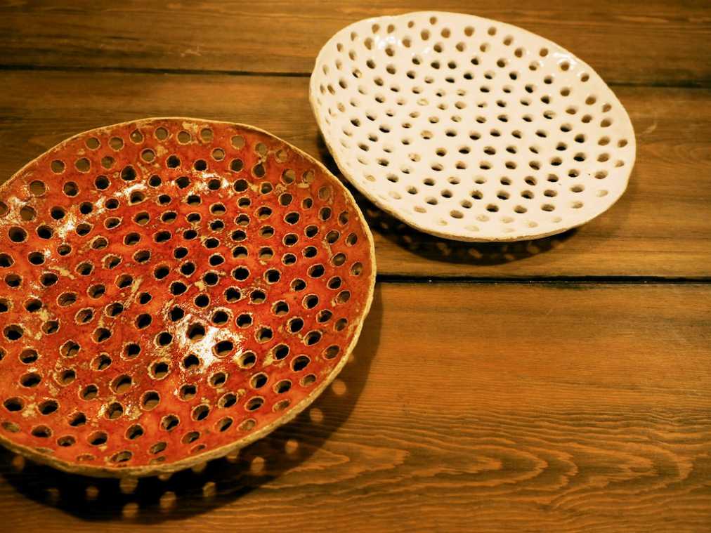 さまざまな雑貨の中でも食器が特に大好きだという塩野さんは、海外の作家さんによるお皿も多数買いつけています。写真は、独特なセンスが光るキッチン雑貨を作ることで知られているロシアの作家「Vsocks(フソースク)」さんの作品。お皿なのにたくさんの穴が空いているビジュアルはインパクト大!ほかのお店にはなかなか置いていなさそうな、ひねりのあるデザインですね。