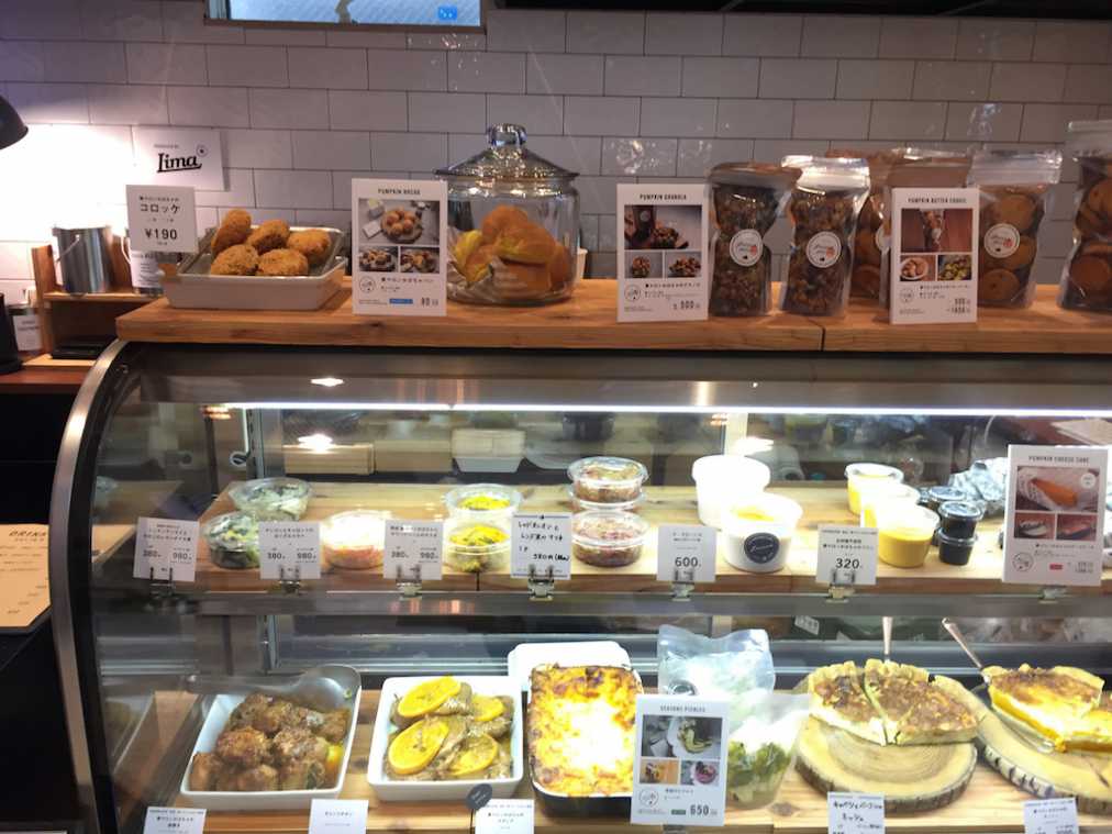 ショーケースに並ぶデリは、毎日約15種類。「栗マロンかぼちゃのサラダ」(350円~)や、3種類から好きなソースを選べる「フライドズッカ」(400円~)がとくにおすすめ。
