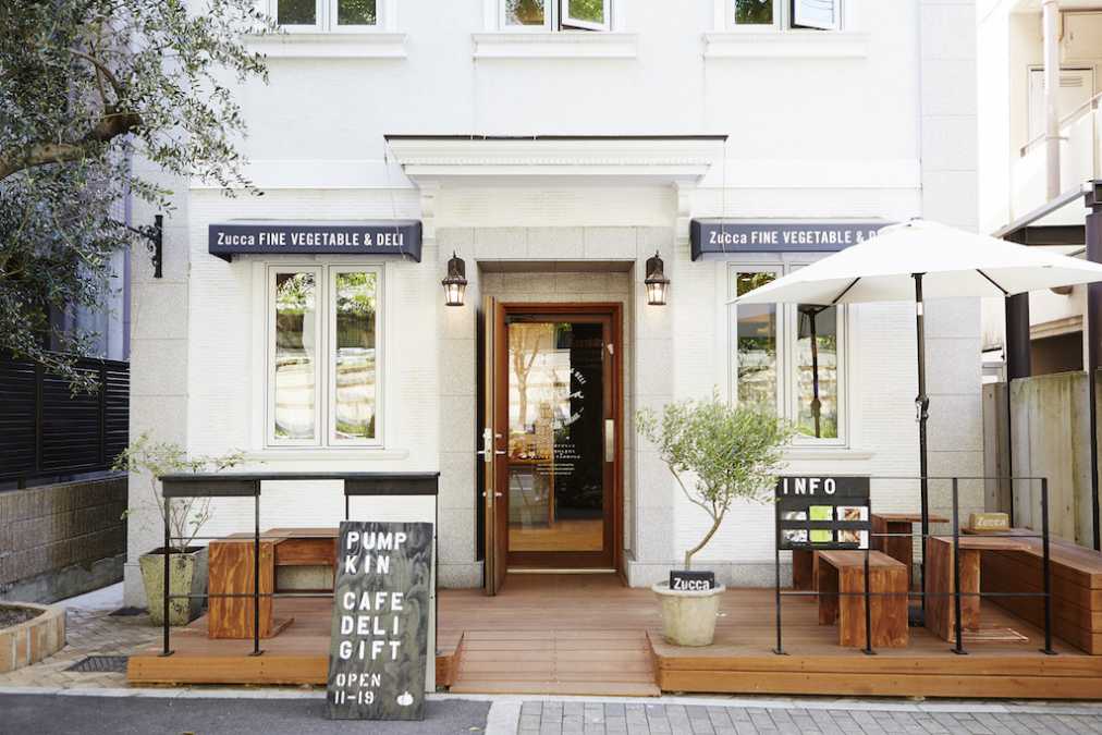 阪急御影駅から歩いて5分ほど、山手幹線通り沿いにひときわ目をひく白い建物があります。こちらが、「Zucca FINE VEGETABLE &DELI(ズッカ ファイン ベジタブル アンド デリ)」。2015年にオープンした、「栗マロンかぼちゃ」を主役にした専門店です。