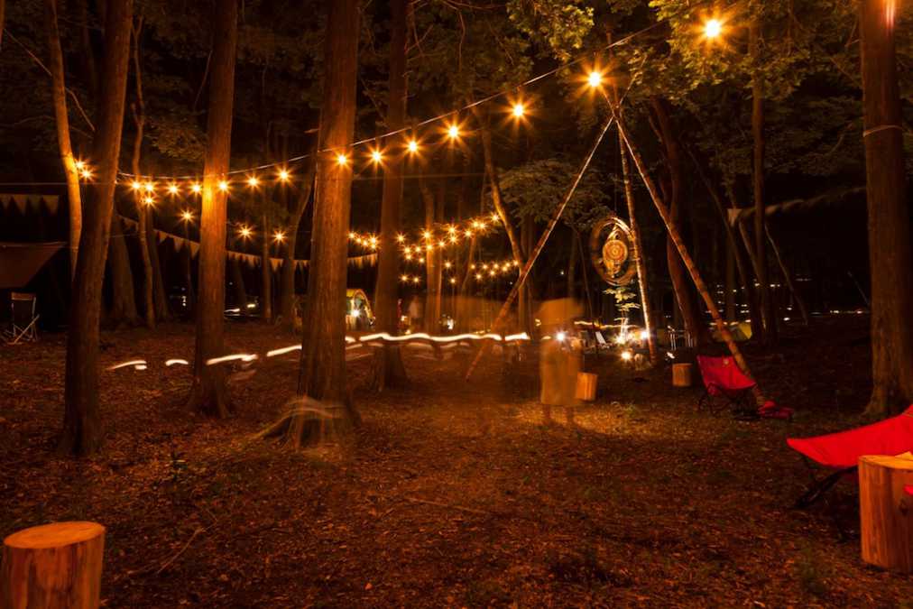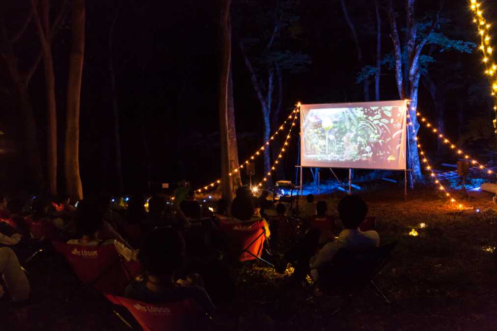 夜の森では、一夜限定で映画館がオープン。ランタンの明かりが灯る幻想的な雰囲気の中、夜風を感じながらの映画鑑賞という“非日常”は体験する価値あり!
