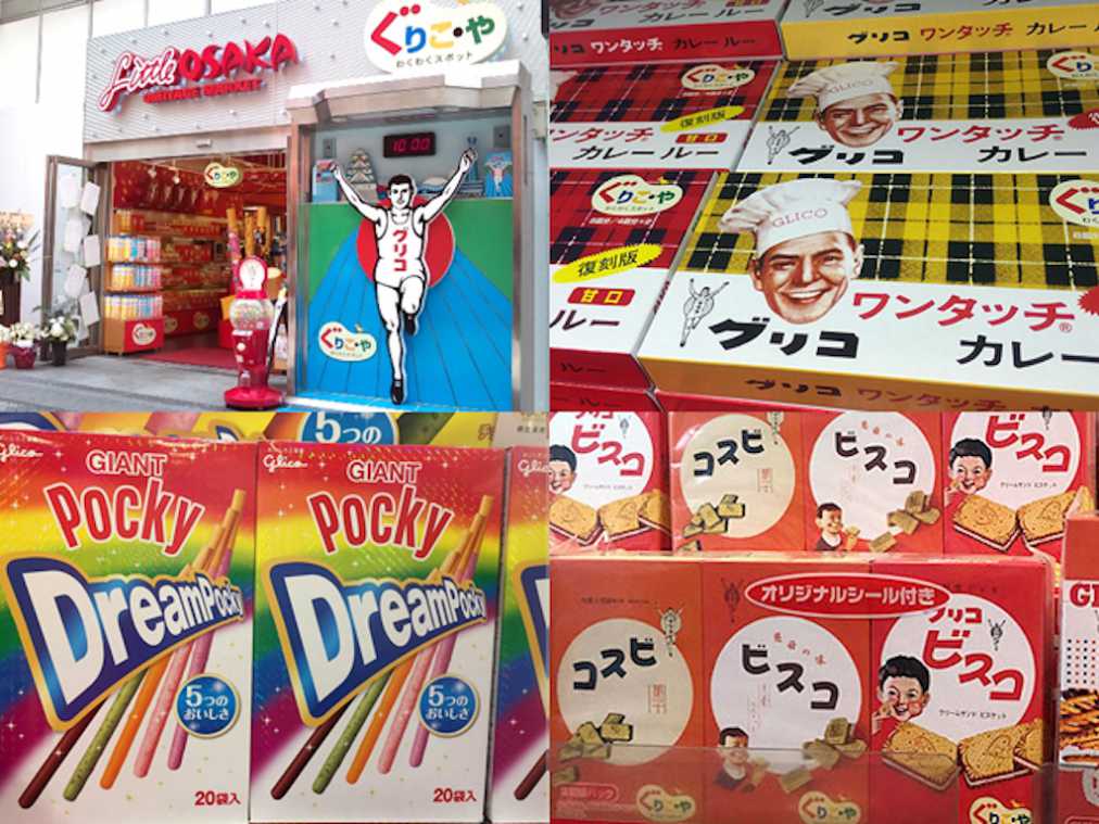 どーんと構えるグリコサイン下の戎橋を渡ると、そこはもう道頓堀。動く「かに」や「たこ」さん、「フグ」、「だるま大臣」など個性的なビジュアル看板が目白押しで、看板写メはマストです。まずはグリコランナーが出迎えてくれる「ぐりこ・や」さんで、昔懐かしいグリコ商品を見てみましょう。1番人気はジャイアントドリームポッキー(1296円)。大阪みやげにも◎。