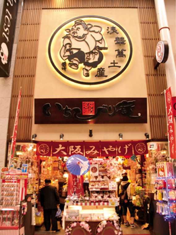 道頓堀のメインストリートを1本入ったところにあるのは、常時4000点以上のアイテムが並ぶ大阪みやげのメガストア。ユニークなキャラグッズから、しゃれのきいたオリジナルみやげまで、いかにも大阪な逸品がずらり。大阪みやげのまとめ買いにおすすめです。