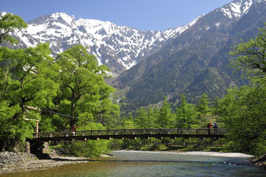 キラキラと輝く梓川に架かる河童橋は、上高地の代表的な景勝スポット。橋越しに穂高連峰を一望できます。