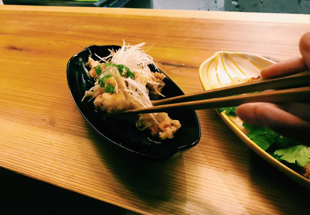 お酒を頼んだ後は、お楽しみの唐揚げ。鶏の部位10種(もも、むね、ささみ、皮、ぼんじり、手羽元、砂肝、レバー、ヤゲン軟骨、せせり)、味10種(醤油にんにく、塩麹、柚子胡椒、梅、カレー、わさび、南蛮、ペペロンチーノ、パクチー、土佐酢)から好みの組み合せでオーダーします。