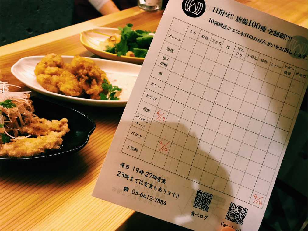 こちらは最近スタートしたイベント、「目指せ!!お茶割り&唐揚げ100種全制覇!!!」自分が頼んだ組み合せに日付を書いてもらえ、10種達成ごとにおばんざいや、お酒のプレゼントが!ちなみに、筆者が行ったときは、まだ100種制覇した強者はいないとのことでした。