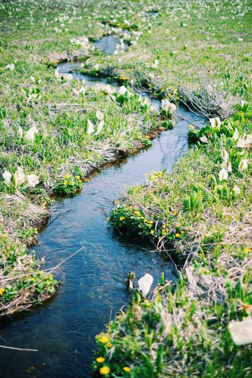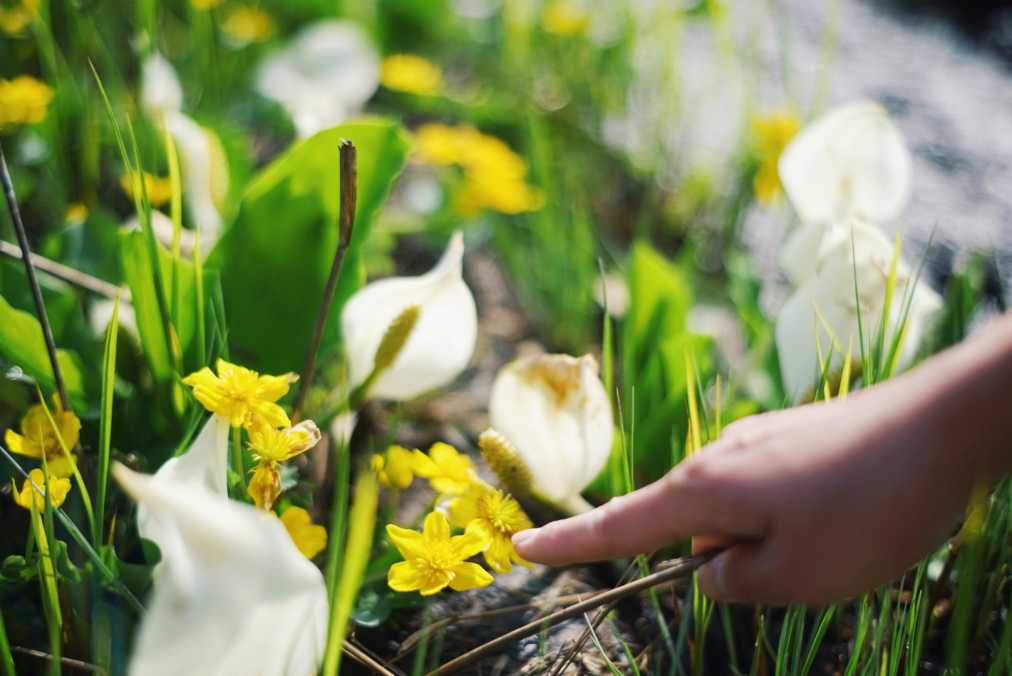 “白い妖精”と呼ばれるほど愛らしい姿のミズバショウは尾瀬を代表する花。ひとつひとつ形が違うので、ついお気に入りを探してしまいます。黄色い花はリュウキンカ。