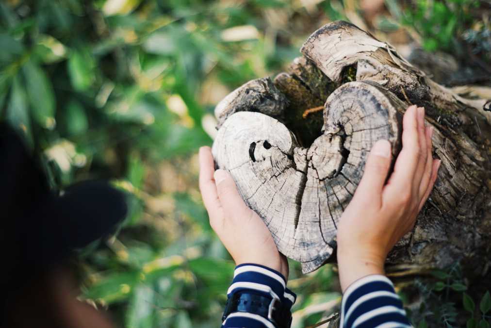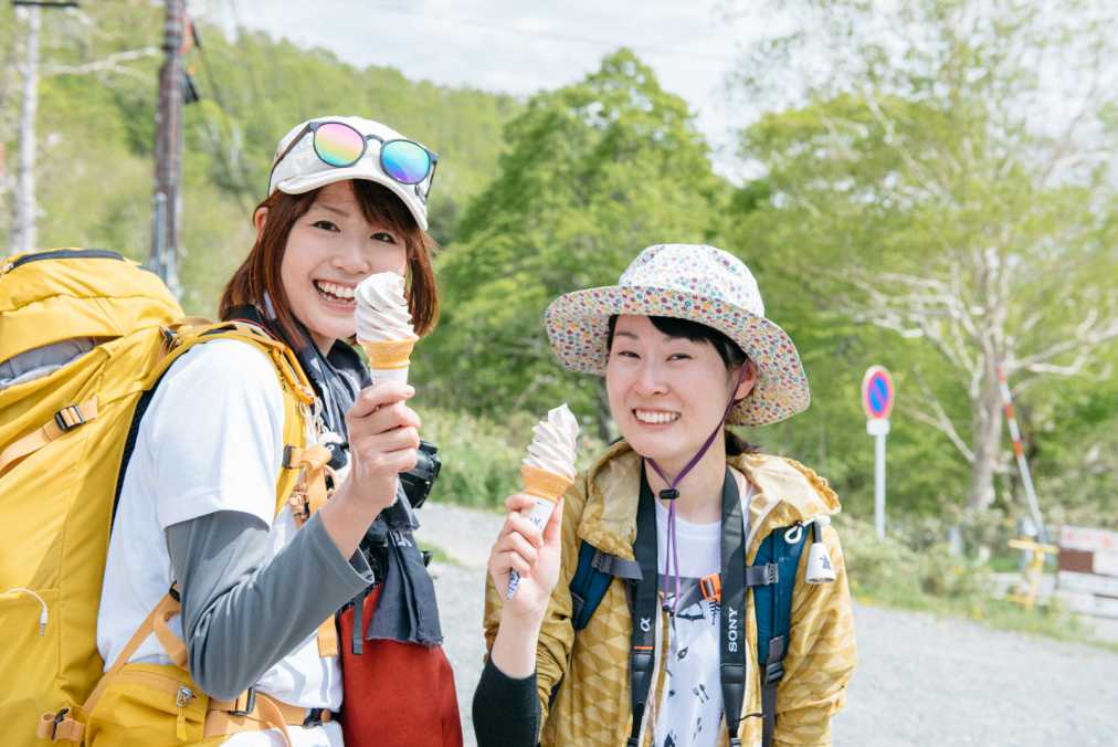 もろんのんアドバイス:こちらは東電小屋の入口前にあったハート型の切り株。触ると恋愛のご利益があるとか…!実際に触れてもらっているところを写真に撮ると、そのサイズ感がわかり、かつ写真にストーリー性がでるのでおすすめです。今回は一緒に歩いたメンバーにお願いして、ハートに手を添えてもらいました。
