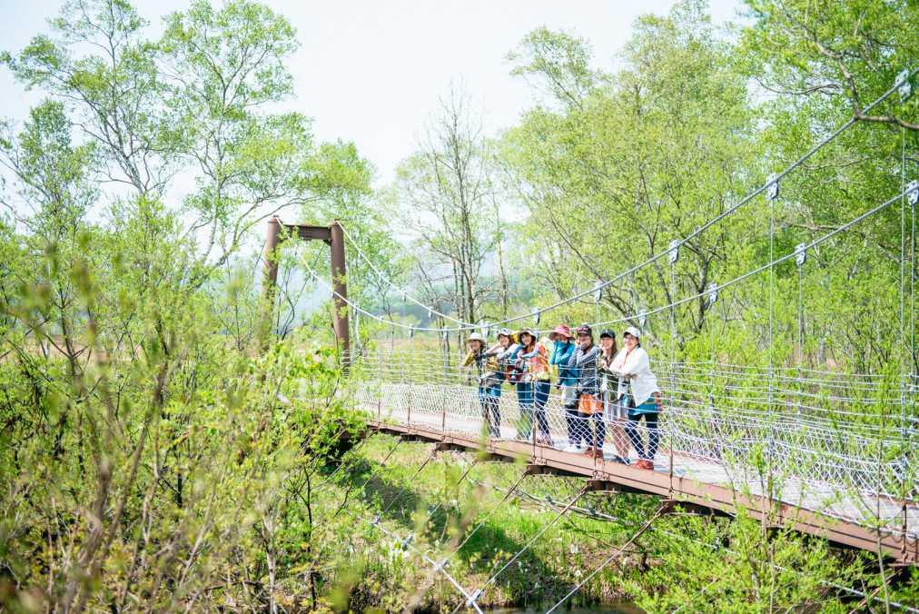 ヨッピ吊橋に到着。「ヨッピ」とはアイヌ語で「集まる」「別れる」などを意味します。尾瀬を歩くたくさんの人とすれ違いながら、ヨッピ川の流れに想いを馳せました。