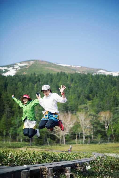 思いっきりジャンプをして撮影してみたり。背景にはまだ雪の残る至仏山(しぶつさん)と青空がきれいに写りました。