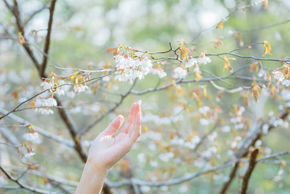山の中で咲いているのはミネザクラ。早朝の光を受けて、まるで輝いているようです。少し控えめなピンクと、下を向いて咲く花の様子が可憐。
