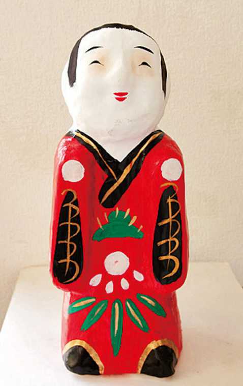 ぱっと目を引く赤い着物が印象的な奉公さん(中1944円)は、高松張子を代表する人形。ほのぼのとした表情に癒やされます。自分が仕える姫の病を移しとったという少女「おマキ」をモチーフにしたもので、子どもに抱かすと病が治ると親しまれてきた縁起物です。