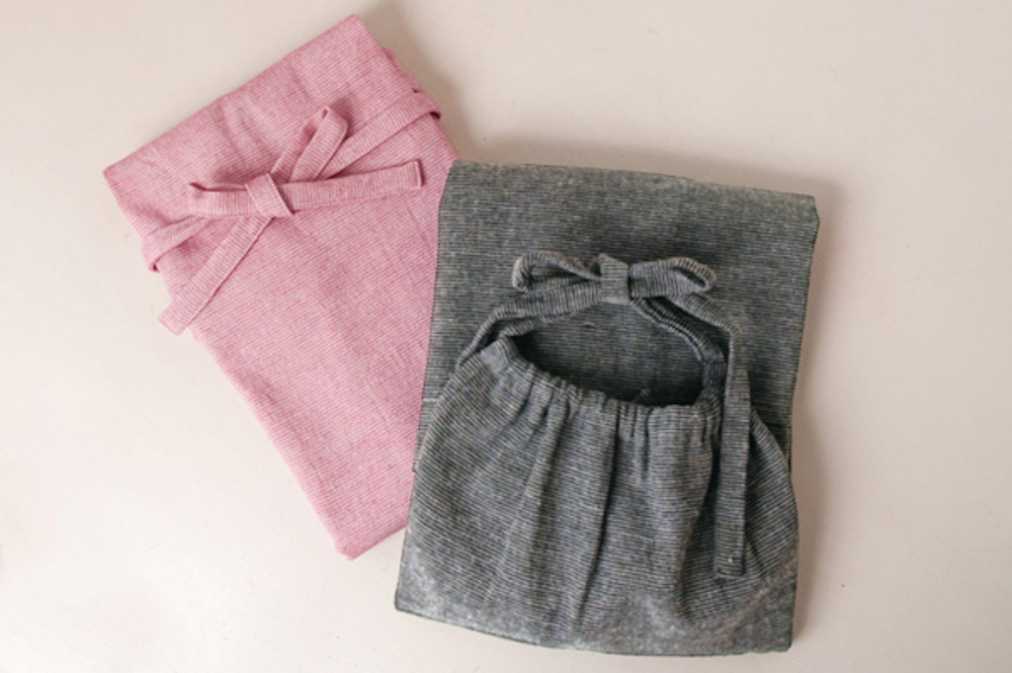 こちらはふんわり柔らかな肌触りがうれしい保多織のエプロン6720円〜。洗うたびに増していく風合いに、愛着も湧いていきます。