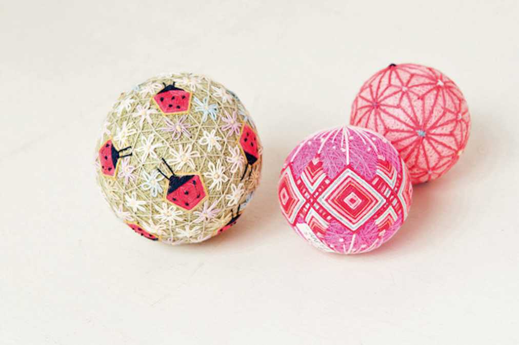 こちらは、木綿の糸を草木染めして作った讃岐の手まり3880円〜。自然の素材で染めた色とりどりの糸を、一針一針かがって繊細な模様を描き出しています。ころんとしたフォルムは部屋に飾りたくなる愛らしさ。