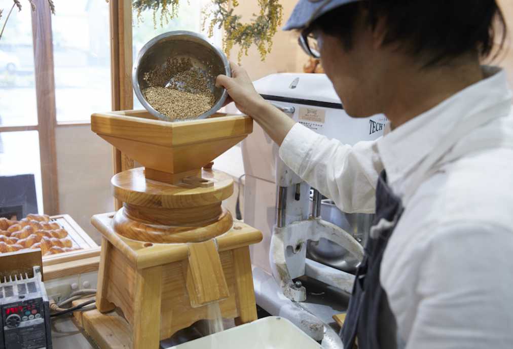 「小麦(玄麦)はミキシングする前に、石臼で製粉します」と酒井さん。小麦本来の風味を感じてほしい、という思いから、挽きたてにこだわっているのだとか。