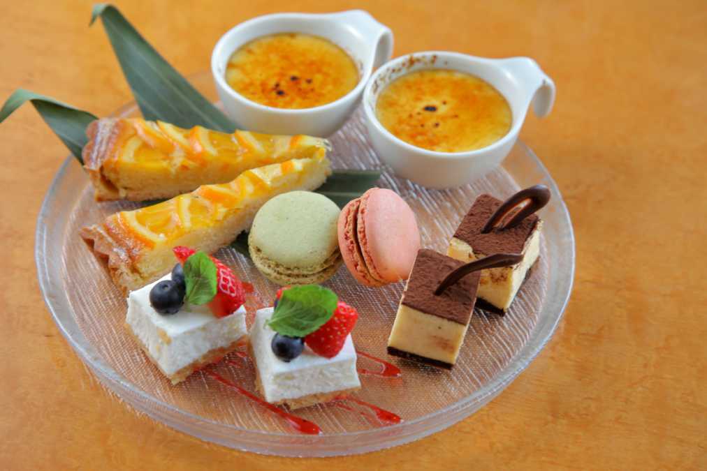 2段目はティラミス、チーズケーキ、マカロン、オレンジタルト、クリームブリュレ。ひと口&ふた口サイズのかわいいミニスイーツが並んでいます。