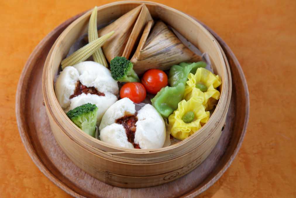 こちらが1段目のシンガポール飲茶セット。チャーシュー饅包、中華ちまき、翡翠エビ餃子、黄華花咲焼売、温野菜の5種類で、彩り豊かで見た目にも食欲をそそります。ホカホカのままテーブルに運ばれてくるので、温かいうちに召し上がれ!