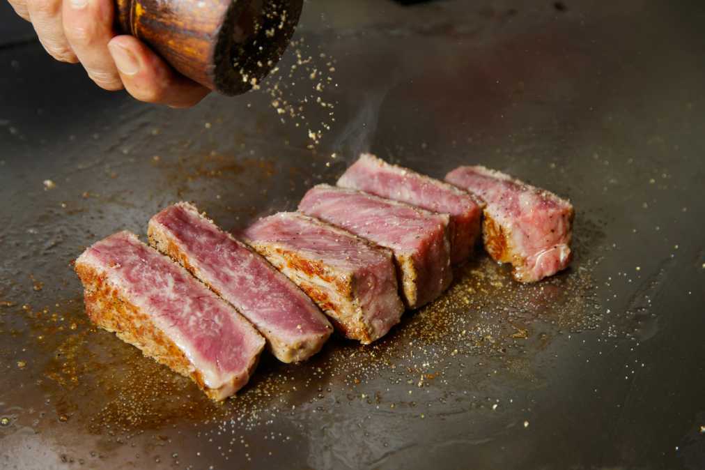 目の前で調理してくれるパフォーマンスやシェフとの会話も楽しい時間。好みの焼き加減を伝えると、その日の肉の厚みや霜降りの状態を見て最高の状態で焼き上げてくれます。切り分ける様子からも肉の柔らかさが伝わり、自ずと期待が高まります。