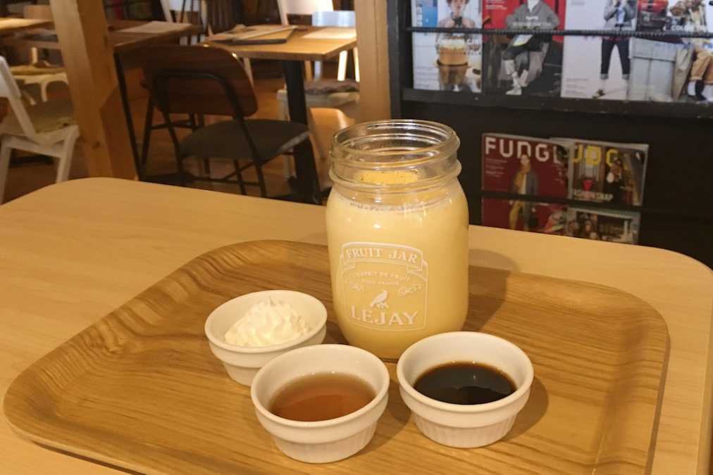 <人気はこだわり卵をつかった「うたたねジャープリン」580円。コクのあるプリンにメープルや黒蜜をお好みでトッピング。たっぷり3人前あるのでシェアしていただきましょう!