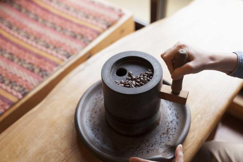 ミニサイズの石臼をまわすと、少しずつコーヒーの香りが立ってくるのを感じられます。ゆっくりと粉になっていく時間も楽しいんです。