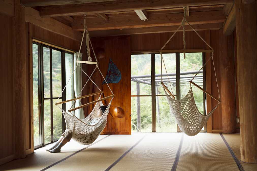 1階の広間やテラスなどに設置されたハンモックにごろんと寝ころんでみて。ゆらゆらと自然の中に溶け込んでいくような感覚も味わえます。