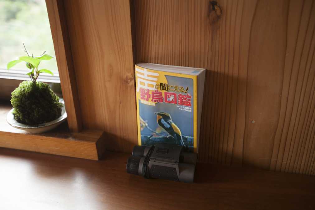 双眼鏡や野鳥図鑑が置いてあるので、近くに遊びに来た鳥を探してみたり、お気に入りの本をもっていってのんびり読書にふけるのもおすすめです。ぼんやりと景色を眺めているだけでも、心がすーっと軽くなるようです。