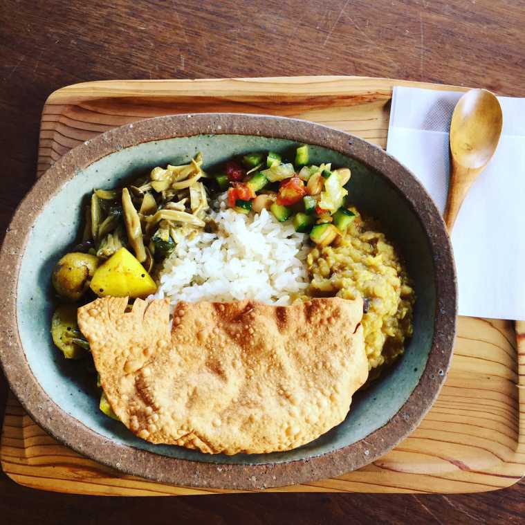 ランチは、本日のカレー700円。地元でとれた新鮮な食材をたっぷり使った、グリーンカレーやスリランカカレーなどが週替わりで登場します。軽めの食事がよければ、おむすび2個300円を。渡辺さんが手作りした、ほどよい塩加減のぬか漬け付きです。