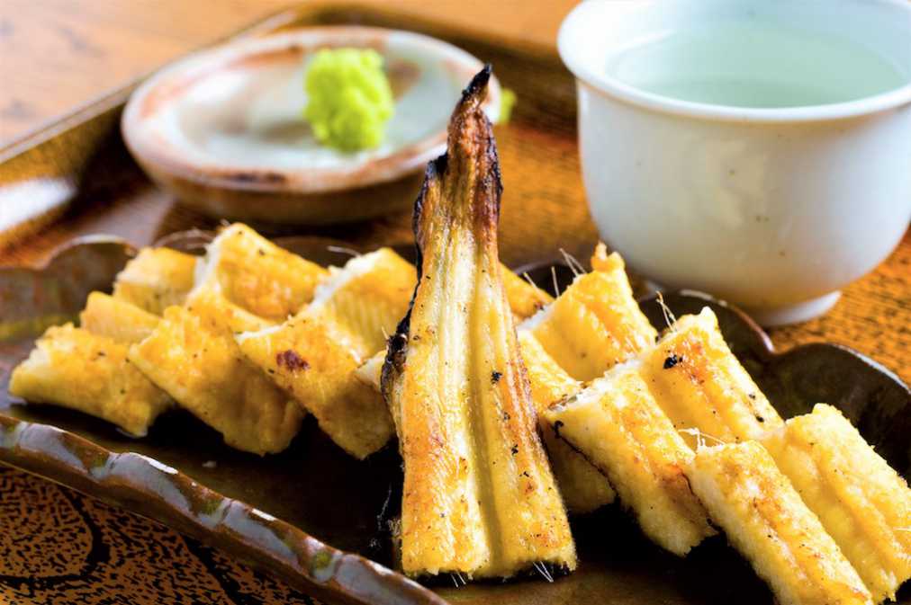あなごめしのほかにぜひ味わってほしいのが、穴子白焼き1296円。外側はパリッ、内側はふわっとした焼きたてならではの食感がたまりません。薬味の岩塩とワサビが、アナゴ本来のうま味をしっかり引き立ててくれます。