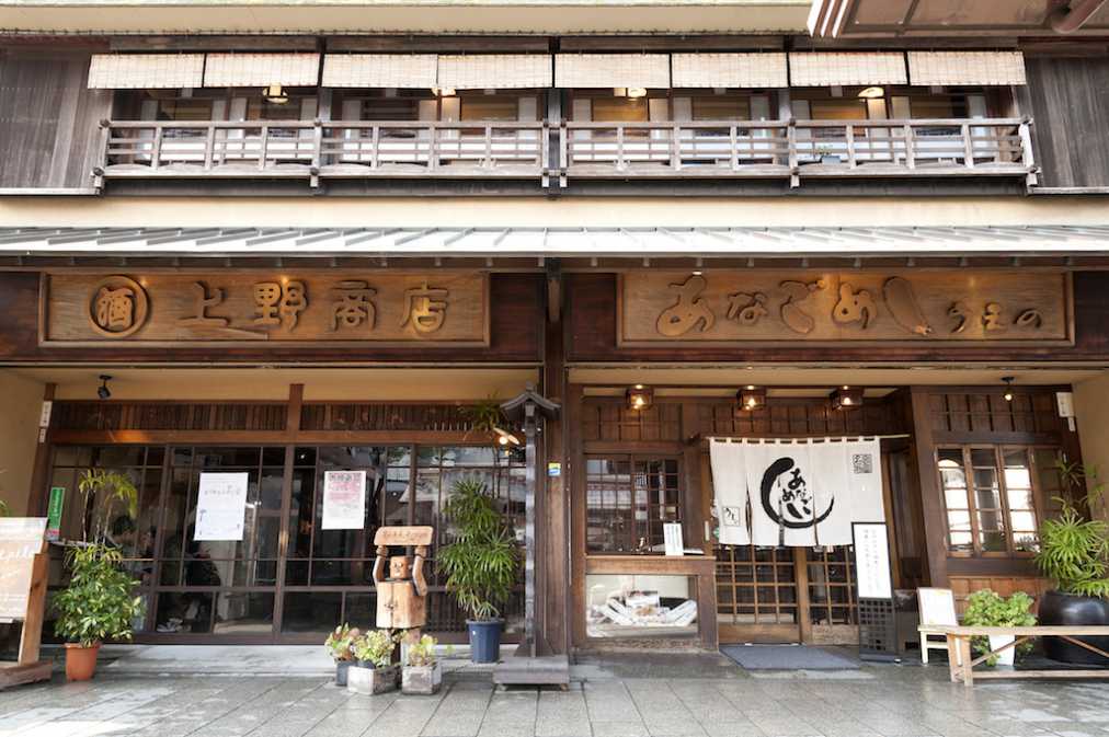 4代目である現店主の生家を改装して利用しているという、重厚な外観にも歴史を感じます。写真右側が「あなごめし うえの」の店舗です。休日のランチタイムを中心に30分以上並ぶこともあるので、写真左側の「上野商店」内の控え室でゆっくり順番を待ちましょう。