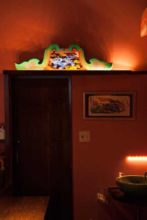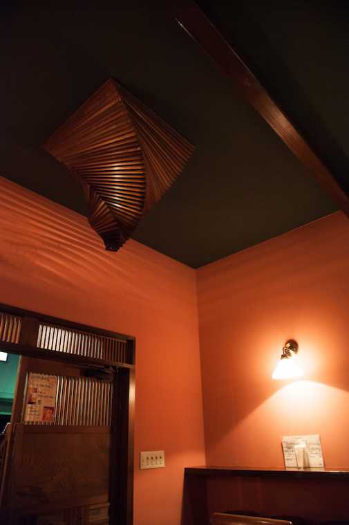 入口はアーティスティックでモダンな手彫りの扉。店内は天井のグリーンや壁のオレンジがかった朱色など、懐かしくも味わい深い色合いが絶妙です。