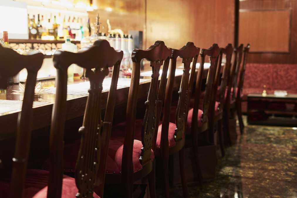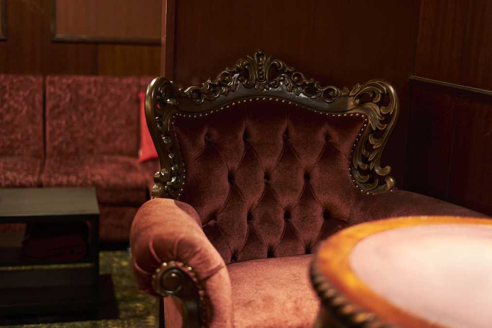 濃いブラウンとワインカラーを基調とした店内は、まさに大人の隠れ家。ロココ調のソファやムーディーな照明が、非日常感を演出してくれます。