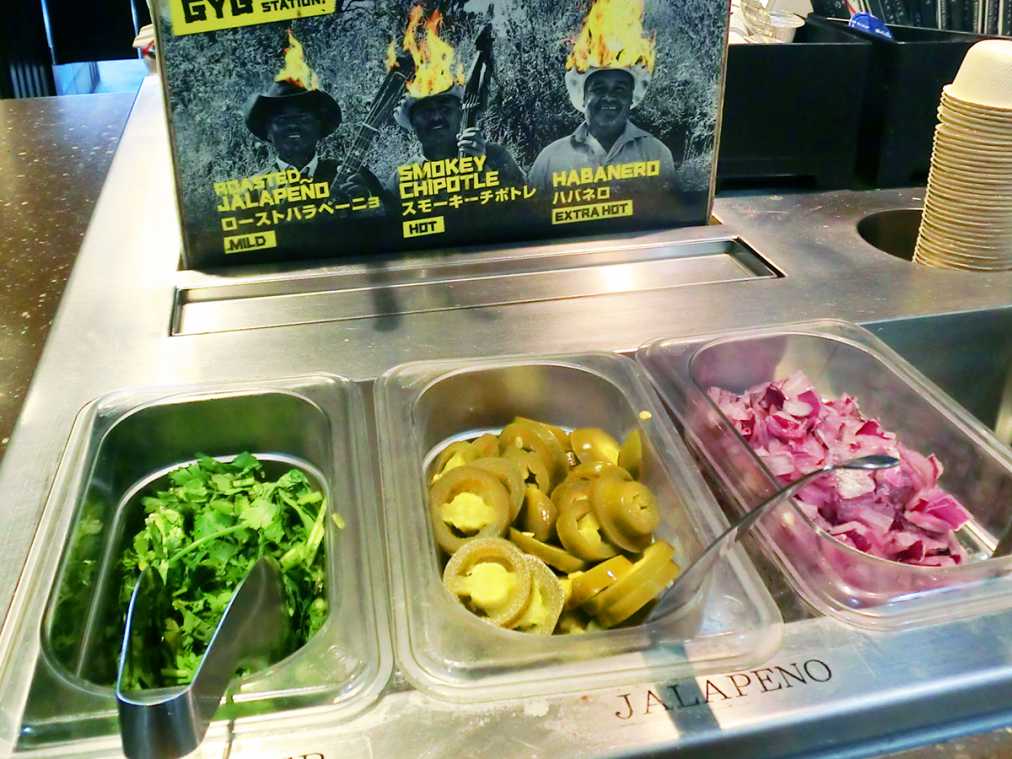 ちなみに無料のトッピングコーナーでは、フレッシュなパクチー、ハラペーニョのピクルス、紫玉ねぎのほか、頭から火を噴く(!?)ほどの激辛ソースが3種あるので、味を変えながら食べるのもいいですね。